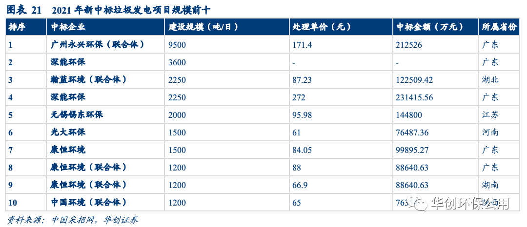 產(chǎn)能視角:行業(yè)步入成熟期,馬太效應(yīng)明顯。據(jù)不完全統(tǒng)計,2022年1-4月垃圾焚燒新中標(biāo)項目數(shù)量較去年同期有所提升,但訂單的釋放省份多數(shù)位于中部地區(qū),日處理量超過1000噸僅3個,故新增產(chǎn)能和投資額同比分別下滑;后補(bǔ)貼時代,新中標(biāo)的垃圾焚燒發(fā)電項目噸垃圾處置費上浮明顯,較2021年平均79.72元/噸增長20.21%。高質(zhì)量項目中標(biāo)企業(yè)以頭部公司為主,鮮有小公司的身影出現(xiàn),行業(yè)馬太效應(yīng)繼續(xù)增強(qiáng)。
