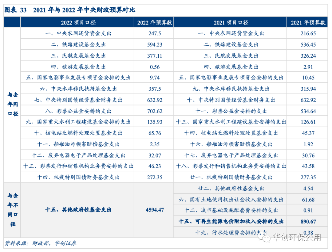 22年政府預(yù)算支出中有4500億元的補(bǔ)貼增量或?qū)⒂糜诳稍偕茉囱a(bǔ)貼的一次性發(fā)放。2022年與2021年中央財政預(yù)算支出的口徑發(fā)生了變化,其中21年出現(xiàn)的“可再生能源電價附加收入安排的支出”科目在22年的財政支出預(yù)算中消失,22年的統(tǒng)計口徑中其他政府性基金支出項目由21年的4.54億元驟增至4594.47億元。考慮到22年將21年的若干個口徑進(jìn)行合并,假設(shè)除可再生能源補(bǔ)貼項目的其他合并項目預(yù)算支出保持不變,預(yù)計今年將能騰挪出4500億元的財政支出供可再生能源補(bǔ)貼的發(fā)放,此前的拖欠問題有望得到一次性解決。
