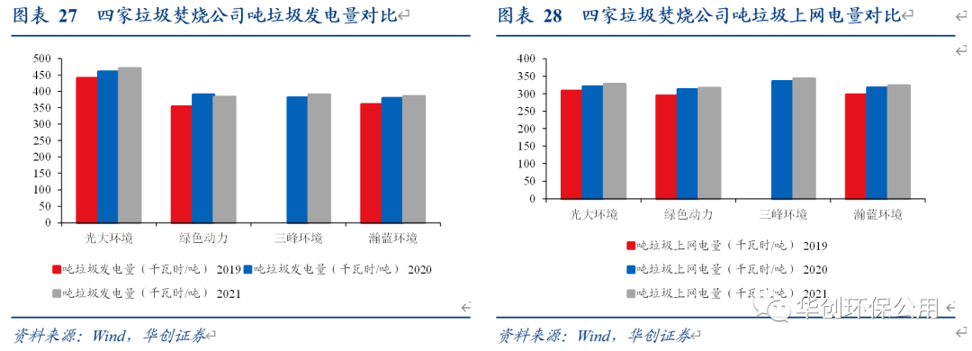 我們選取光大環(huán)境、三峰環(huán)境、瀚藍(lán)環(huán)境和綠色動力四家上市公司進(jìn)行比較,所有公司的2019-2021年的噸垃圾發(fā)電量與噸垃圾上網(wǎng)電量均呈現(xiàn)上升趨勢。2021年光大環(huán)境的噸垃圾發(fā)電量已達(dá)到470度,大幅領(lǐng)先其余公司;噸上網(wǎng)電量四家公司差距不大,均在320-340度這一區(qū)間。我們認(rèn)為噸垃圾發(fā)電量的逐年提升亦可以增厚垃圾焚燒項目的盈利能力,削弱國補(bǔ)退坡的不利影響。