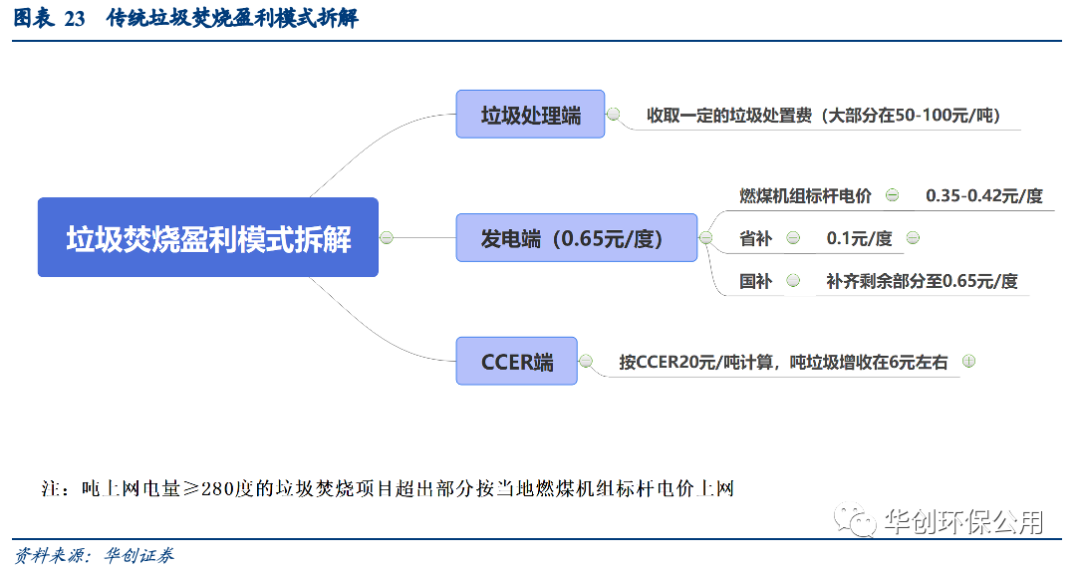 按照傳統(tǒng)盈利模式拆解,噸垃圾上網(wǎng)電量和垃圾處理費是影響垃圾焚燒發(fā)電運營收入的主要因素。理想情況下,垃圾焚燒發(fā)電的商業(yè)模式優(yōu)質(zhì)清晰,處理費主要和項目所在地政府的財政支付能力有關(guān),而噸垃圾上網(wǎng)電量則與公司的技術(shù)手段和垃圾熱值有關(guān)。但近兩年行業(yè)內(nèi)即出現(xiàn)了如國補(bǔ)退坡這樣的擾動因素,也出現(xiàn)了CCER 等利潤增厚因素,此部分我們將詳細(xì)剖析各類新變化對盈利因子的擾動情況。