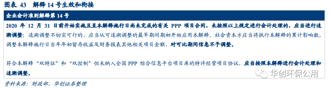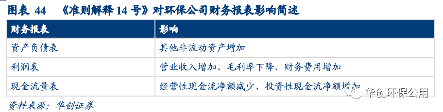 解釋14號要求對部分借款費用予以費用化處理。解釋2號中對價類型(無形資產(chǎn)模式、金融資產(chǎn)模式或混合模式)對借款費用資本化沒有影響而解釋14號明確借款費用的資本化對象是無形資產(chǎn),對價類型是金融資產(chǎn)或者是混合模式下的金融資產(chǎn)部分,相關(guān)的借款費用均應(yīng)予以費用化。我們認(rèn)為該會計準(zhǔn)則的變更是2021年部分環(huán)保上市公司財務(wù)費用上漲的原因之一。