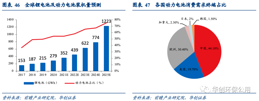 在電動汽車市場快速增長帶動下,動力型鋰離子電池繼續(xù)保持快速增長勢頭。全球動力電池年新增裝機(jī)量保持快速增長,根據(jù)前瞻產(chǎn)業(yè)研究院的預(yù)測,2025年全球鋰電池裝機(jī)量將會達(dá)到1223GWh,動力電池占比高達(dá)75.2%。2020年中國動力電池終端消費需求高達(dá)44.1%,居世界第一位。硫酸鈷和硫酸鎳是生產(chǎn)三元動力電池的重要材料,未來有望量價齊升。