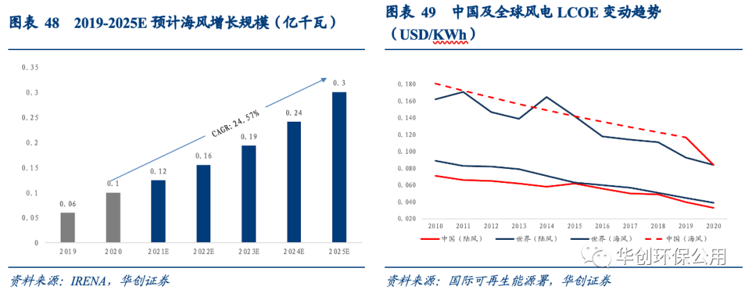 海上風(fēng)電增長空間巨大,平價節(jié)點或?qū)⒂瓉硌b機(jī)潮。海上風(fēng)電“十四五”期間預(yù)計新增裝機(jī)200GW,20-25年CAGR約25%,高于十四五期間風(fēng)電整體13.5%的增速。隨著海風(fēng)伙伴計劃首次提出海風(fēng)將于2024年實現(xiàn)平價,海風(fēng)或?qū)⒂谄絻r節(jié)點迎來裝機(jī)潮,海風(fēng)未來發(fā)展可期。