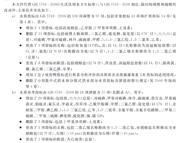 從主要技術(shù)層面上看,新標(biāo)準(zhǔn)顯示水質(zhì)指標(biāo)由GB 5749- 2006 的106 項調(diào)整為97項,包括常規(guī)指標(biāo)43項和擴(kuò)展指標(biāo)54項。水質(zhì)參考指標(biāo)由GB 5749- 2006 的28項調(diào)整為55項。