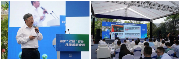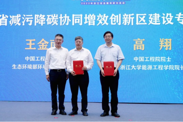 活動現(xiàn)場,省生態(tài)環(huán)境廳黨組書記、廳長郎文榮聘請王金南院士和高翔院士為浙江省減污降碳協(xié)同增效創(chuàng)新區(qū)建設(shè)特聘專家。王金南院士作《協(xié)同減污降碳 建設(shè)美麗中國》主旨演講,杭州市余杭區(qū)、臺州市椒江區(qū)大陳鎮(zhèn)和嘉興市海寧市袁花鎮(zhèn)長嘯村等單位代表共同交流分享了低(零)碳試點經(jīng)驗。