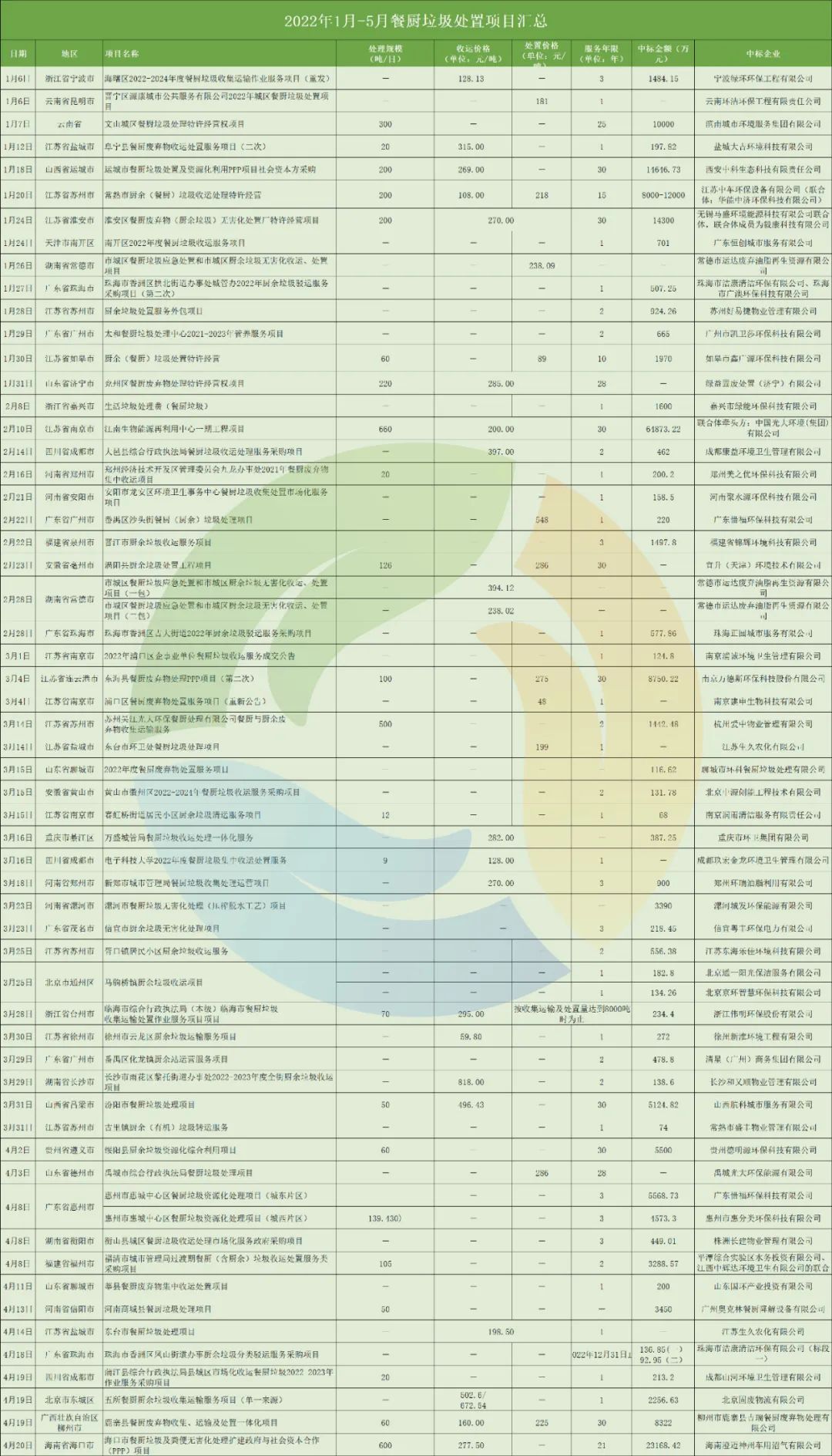 此外,在統(tǒng)計(jì)數(shù)據(jù)中,我們還可以發(fā)現(xiàn)本地國(guó)企中標(biāo)趨勢(shì)明顯增強(qiáng)。例如,宜昌建投水務(wù)有限公司中標(biāo)了1.6億的宜昌市廚余垃圾資源化處理特許經(jīng)營(yíng)權(quán)項(xiàng)目,眉山市城投中恒能環(huán)??萍加邢薰緞t中標(biāo)了1.1億眉山市餐廚垃圾綜合利用項(xiàng)目。近年來(lái),不少企業(yè)憑借自身優(yōu)勢(shì)與政府簽訂了餐廚垃圾/廚余垃圾項(xiàng)目單一來(lái)源采購(gòu)協(xié)議。其中,北京固廢物流有限公司就以單一來(lái)源的方式拿下了2256萬(wàn)的北京市東城區(qū)五所餐廚廚余垃圾收集運(yùn)輸服務(wù)項(xiàng)目。這類(lèi)項(xiàng)目最大特點(diǎn)就是只有一家供應(yīng)商,不存在競(jìng)爭(zhēng)。不過(guò),在2021年發(fā)布的97個(gè)餐廚/廚余垃圾項(xiàng)目中,有18個(gè)項(xiàng)目為單一來(lái)源方式,占比18.56%,其中多以收運(yùn)處理一體化項(xiàng)目為主。今年單一來(lái)源方式采購(gòu)項(xiàng)目明顯減少。而隨著垃圾焚燒項(xiàng)目“降溫”,龍頭企業(yè)布局餐廚垃圾市場(chǎng)的步伐也逐漸加快。2022年1-5月,光大環(huán)境共中標(biāo)3個(gè)餐廚垃圾處理項(xiàng)目,拿標(biāo)數(shù)量位居中標(biāo)企業(yè)第一位,項(xiàng)目總預(yù)算金額超6億元(2021年同期,光大環(huán)境拿下3個(gè)項(xiàng)目,拿標(biāo)數(shù)量位居中標(biāo)企業(yè)第一位)。從不久前發(fā)布的2021年光大環(huán)境年報(bào)中可以看出,餐廚垃圾處理項(xiàng)目為光大環(huán)境凈利潤(rùn)增長(zhǎng)助力不少。而作為環(huán)衛(wèi)市場(chǎng)老牌企業(yè)的盈峰環(huán)境,2019開(kāi)始切入餐廚市場(chǎng)。去年,盈峰環(huán)境全資子公司廣東盈峰環(huán)境投資有限公司中標(biāo)淮安餐廚擴(kuò)建項(xiàng)目,該擴(kuò)建項(xiàng)目建成后,合同總額預(yù)計(jì)73612萬(wàn)元(含收轉(zhuǎn)運(yùn)合同總額33236萬(wàn)元)。今年,盈峰環(huán)境又拿下了2個(gè)餐廚項(xiàng)目,分別位于湖南、安徽、廣東三省,服務(wù)范圍已從前端環(huán)衛(wèi)項(xiàng)目運(yùn)營(yíng)到末端的餐廚垃圾處置,成為跨界經(jīng)營(yíng)的典范。還有長(zhǎng)期從事垃圾滲濾液相關(guān)裝備制造和運(yùn)營(yíng)業(yè)務(wù)的萬(wàn)德斯,2021年計(jì)劃以2.36億的價(jià)格收購(gòu)時(shí)代桃源,切入有機(jī)垃圾領(lǐng)域(后停止收購(gòu))。今年取得了江蘇省連云港市東??h餐廚廢棄物處理PPP項(xiàng)目,處置規(guī)模為100噸/日。值得注意的是,北清環(huán)能在最近一年內(nèi)累計(jì)花費(fèi)8億元大規(guī)模收購(gòu)餐廚項(xiàng)目,業(yè)務(wù)呈快速發(fā)展態(tài)勢(shì)。總體來(lái)看,我國(guó)餐廚垃圾處理行業(yè)雖然發(fā)展10年有余,但始終發(fā)展緩慢,項(xiàng)目和企業(yè)規(guī)模都比較小,競(jìng)爭(zhēng)格局較為分散,目前尚沒(méi)有巨頭出現(xiàn)。不過(guò),隨著市場(chǎng)逐漸釋放,單體項(xiàng)目的規(guī)模越來(lái)越大,未來(lái),餐廚垃圾處理市場(chǎng)的巨頭或許也即將出現(xiàn),此次寶安項(xiàng)目可能就是轉(zhuǎn)折點(diǎn)。有人毛利27%,有人虧損