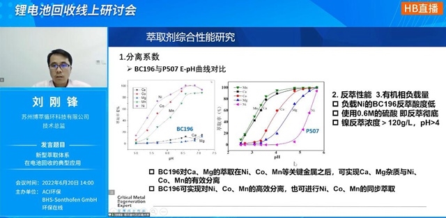 最后,在電池回收濕法工藝弊端凸顯的背景下,新型萃取體系值得期待嗎?這就要聽劉剛鋒技術(shù)總監(jiān)怎么說啦。“使用BC196處理正極溶液得到鎳鈷錳電池級前體相較于傳統(tǒng)流程每噸可節(jié)省10-20%的成本”,從萃取劑綜合性能研究,到鎳鎂分離、鎳鋰分離,再到與現(xiàn)有流程的對比,一應(yīng)俱全。