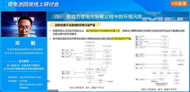 污染擔(dān)責(zé),生產(chǎn)者責(zé)任延伸,全過程監(jiān)管等新變化,鄧毅主任都一一進(jìn)行了解讀,隨后就廢動力鋰電池回收利用的背景、行業(yè)現(xiàn)狀、資源價值、拆解過程的環(huán)境風(fēng)險,《廢鋰離子動力蓄電池處理污染控制技術(shù)規(guī)范》(HJ1186-2021)等內(nèi)容進(jìn)行了梳理,同時提出了幾點(diǎn)建議。