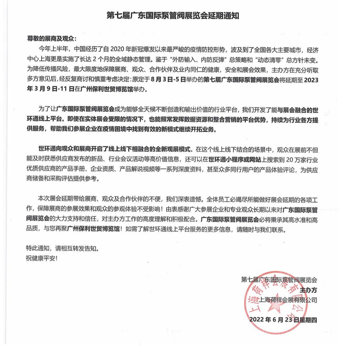今年上半年,中國經(jīng)歷了自2020年新冠爆發(fā)以來最嚴峻的疫情防控形勢,波及到了全國各大主要城市,經(jīng)濟中心上海更是實施了長達2個月的全域靜態(tài)管理。鑒于“外防輸入、內(nèi)防反彈”總策略和“動態(tài)清零”總方針未變。為降低傳播風險,最大限度地保障展商、觀眾、合作伙伴及業(yè)內(nèi)同仁的健康,安全和展會效果,主辦方在充分聽取多方意見后,經(jīng)反復商討和慎重考慮決定:原定于8月3日-5日舉辦的第七屆廣東國際泵管閥展覽會將延期至2023年3月9日-11日在廣州保利世貿(mào)博覽館舉辦。