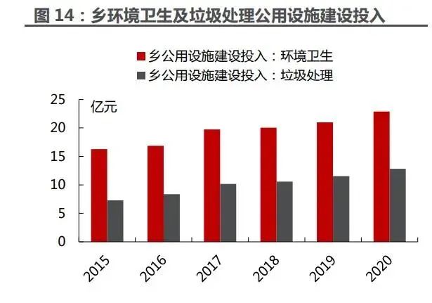 2015-2020 年,市政公用設施建設投入中鄉(xiāng)環(huán)境衛(wèi)生投入持續(xù)提升,2020 年 達 22.89 億元,其中垃圾處理投入為 12.83 億元;2020 年,鄉(xiāng)、建制鎮(zhèn)生活垃圾 無害化處理率分別為 48.46%、69.55%,同期城市生活垃圾無害化處理率接近 100%,主要由于農村生活垃圾收運難度較大,成本高,收運體系不完善等導致。截至 2020 年,我國已新建鄉(xiāng)村公共廁所 38802 座,環(huán)衛(wèi)專用車輛數(shù)為 28560 輛, 隨著農村生活垃圾收運體系建設不斷完善,農村生活垃圾市場空間有望打開,同時 新能源環(huán)衛(wèi)設備的需求或將進一步提升。