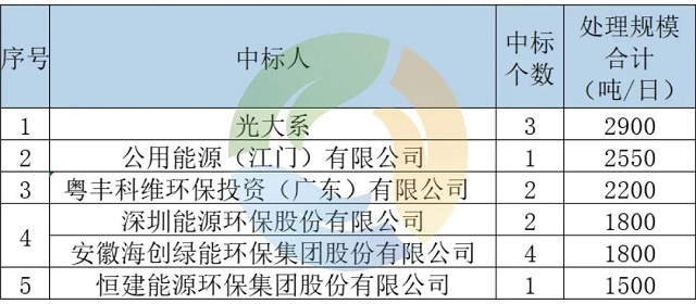 從中標(biāo)企業(yè)上看,26個(gè)項(xiàng)目共計(jì)17個(gè)企業(yè)/集團(tuán)中標(biāo)。按處理規(guī)模統(tǒng)計(jì),前五名企業(yè)排名如下(注:深能環(huán)保和海創(chuàng)綠能并列第四):