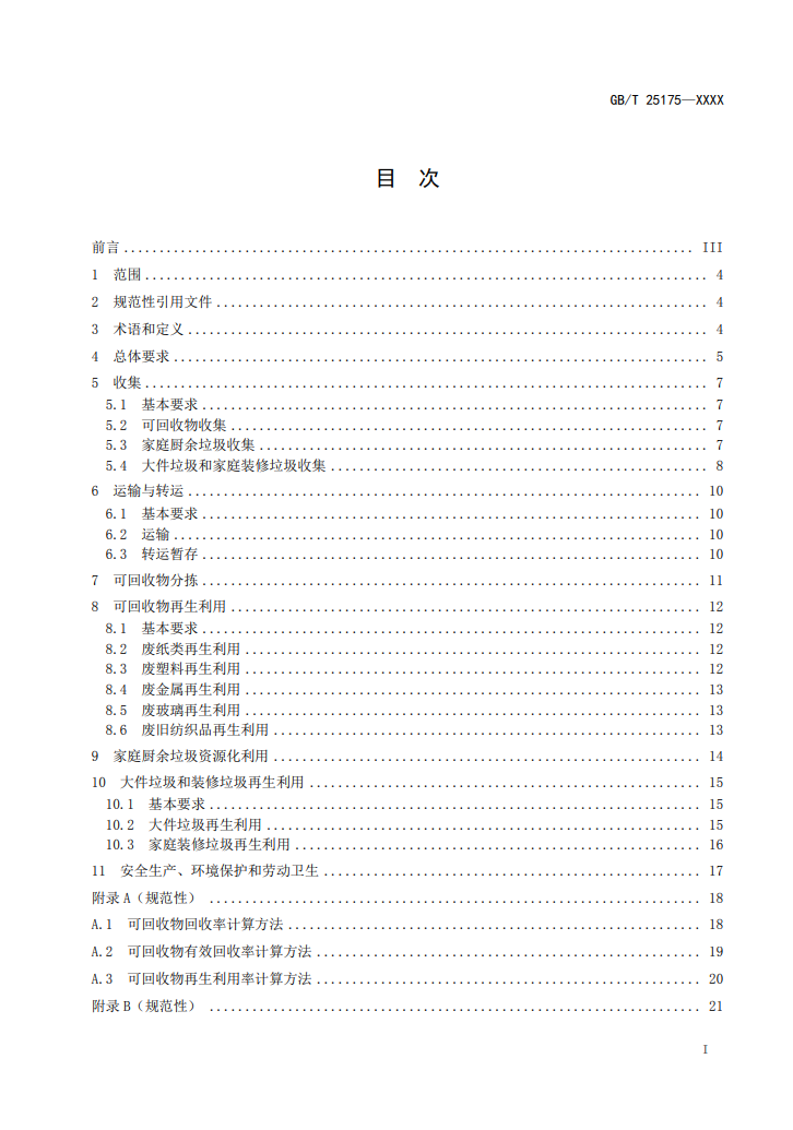 另外標(biāo)準(zhǔn)還對生活垃圾回收利用過程中的安全生產(chǎn)、環(huán)境保護(hù)和勞動(dòng)衛(wèi)生做出了要求,并在附錄中提供了“可回收物回收率計(jì)算方法”、“可回收物有效回收率計(jì)算方法”、“可回收物再生利用率計(jì)算方法”、“家庭廚余垃圾分出率計(jì)算方法”、 “家庭廚余垃圾資源化利用率計(jì)算方法”。