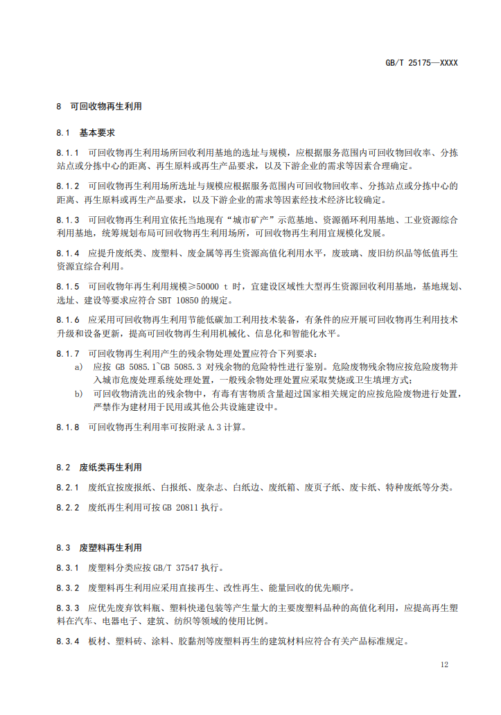 對于可回收物再生利用,標(biāo)準(zhǔn)提出如下基本要求: