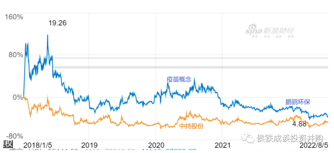 鵬鷂環(huán)保2018年1月份A股上市,增發(fā)8000萬股,融資6個多億。2018年,公司市值借著行業(yè)東風(fēng)達到150億,然后環(huán)保行業(yè)一路走低,鵬鷂市值也跟著一路下滑。2020年公司投資了疫苗概念股,市值反彈到80億。概念過后,一路走低到今天的38億。