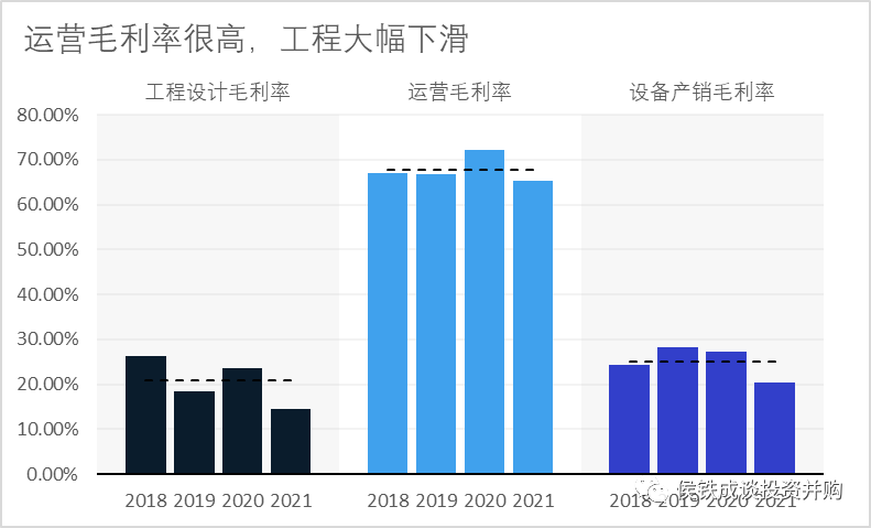 我們再看下各板塊的毛利,工程的收入規(guī)模雖大,但毛利極低。而運營板塊是其核心資產(chǎn)。這個也好理解,一般而言工程業(yè)務(wù)輕資產(chǎn),毛利率雖然很低,但凈資產(chǎn)收益率不低。運營板塊很多都是重資產(chǎn),凈資產(chǎn)收益率可能很低。