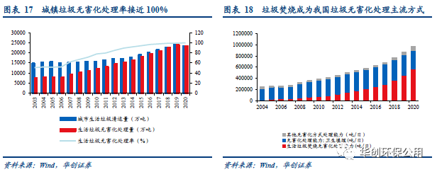 2020年,我國城鎮(zhèn)垃圾無害化處理率為99.75%,焚燒占比接近60%。2020年我國城市垃圾清運量為2.35億噸,其中生活垃圾無害化處理量2.34億噸,占比接近100%,其中焚燒處理量約為1.46億噸(62.3%),填埋處理量7771.54萬噸(33.1%)。日處理能力方面,2020年全國無害化處理能力為96.35萬噸/日,焚燒為56.78萬噸,占比58.93%,較2019年上升24.38%。焚燒已正式超過填埋成為我國垃圾無害化處理主流方式。