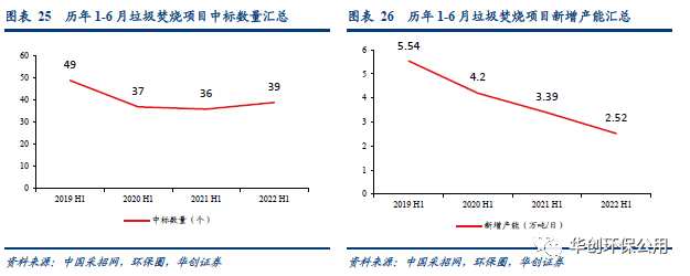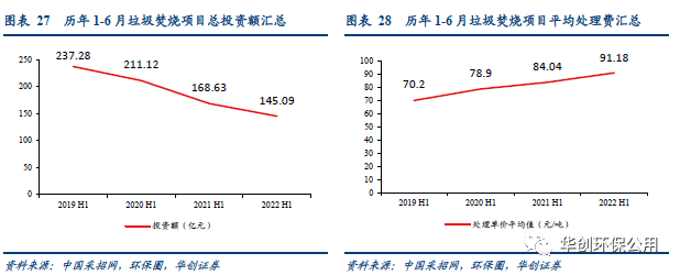 根據(jù)不完全統(tǒng)計,2022年1-6月全國垃圾焚燒發(fā)電項目開標(biāo)數(shù)量為39個,投資總額約為145.09億人民幣,新增產(chǎn)能2.52萬噸/日,垃圾處理單價平均值為91.18元/噸。盡管中標(biāo)項目數(shù)量較去年同期有所提升,但訂單的釋放省份多數(shù)位于中部地區(qū),日處理量超過1000噸僅6個(2021年同期為13個),故新增產(chǎn)能和投資額同比分別下滑25.66%和13.96%至2.52萬噸與145.09億元。但后補貼時代,新中標(biāo)的垃圾焚燒發(fā)電項目噸垃圾處置費上浮明顯,較2021H1平均值84.04元/噸增長8.5%至91.18元。