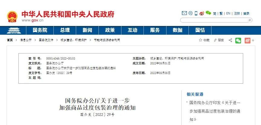 國(guó)務(wù)院辦公廳關(guān)于進(jìn)一步加強(qiáng)商品過(guò)度包裝治理的通知國(guó)辦發(fā)〔2022〕29號(hào)各省、自治區(qū)、直轄市人民政府,國(guó)務(wù)院各部委、各直屬機(jī)構(gòu):商品過(guò)度包裝是指超出了商品保護(hù)、展示、儲(chǔ)存、運(yùn)輸?shù)日9δ芤蟮陌b,主要表現(xiàn)為包裝層數(shù)過(guò)多、包裝空隙過(guò)大、包裝成本過(guò)高、選材用料不當(dāng)?shù)?。近年?lái),各地區(qū)、各部門(mén)按照《國(guó)務(wù)院辦公廳關(guān)于治理商品過(guò)度包裝工作的通知》(國(guó)辦發(fā)〔2009〕5號(hào))部署,認(rèn)真推進(jìn)商品過(guò)度包裝治理,完善相關(guān)法律法規(guī)標(biāo)準(zhǔn),取得積極進(jìn)展。但治理工作仍存在不少薄弱環(huán)節(jié)和突出問(wèn)題,尤其是隨著消費(fèi)新業(yè)態(tài)快速發(fā)展,商品過(guò)度包裝現(xiàn)象有“卷土重來(lái)”之勢(shì)。為貫徹落實(shí)黨中央、國(guó)務(wù)院決策部署,進(jìn)一步加強(qiáng)商品過(guò)度包裝治理,經(jīng)國(guó)務(wù)院同意,現(xiàn)就有關(guān)事項(xiàng)通知如下。各地區(qū)、各部門(mén)要以習(xí)近平新時(shí)代中國(guó)特色社會(huì)主義思想為指導(dǎo),深入貫徹習(xí)近平生態(tài)文明思想,立足新發(fā)展階段,完整、準(zhǔn)確、全面貫徹新發(fā)展理念,構(gòu)建新發(fā)展格局,推動(dòng)高質(zhì)量發(fā)展,認(rèn)真貫徹落實(shí)固體廢物污染環(huán)境防治法、消費(fèi)者權(quán)益保護(hù)法、標(biāo)準(zhǔn)化法、價(jià)格法等法律法規(guī)和國(guó)家有關(guān)標(biāo)準(zhǔn),充分認(rèn)識(shí)進(jìn)一步加強(qiáng)商品過(guò)度包裝治理的重要性和緊迫性,在生產(chǎn)、銷(xiāo)售、交付、回收等各環(huán)節(jié)明確工作要求,強(qiáng)化監(jiān)管執(zhí)法,健全標(biāo)準(zhǔn)體系,完善保障措施,堅(jiān)決遏制商品過(guò)度包裝現(xiàn)象,為促進(jìn)生產(chǎn)生活方式綠色轉(zhuǎn)型、加強(qiáng)生態(tài)文明建設(shè)提供有力支撐。到2025年,基本形成商品過(guò)度包裝全鏈條治理體系,相關(guān)法律法規(guī)更加健全,標(biāo)準(zhǔn)體系更加完善,行業(yè)管理水平明顯提升,線上線下一體化執(zhí)法監(jiān)督機(jī)制有效運(yùn)行,商品過(guò)度包裝治理能力顯著增強(qiáng)。月餅、粽子、茶葉等重點(diǎn)商品過(guò)度包裝違法行為得到有效遏制,人民群眾獲得感和滿(mǎn)意度顯著提升。二、強(qiáng)化商品過(guò)度包裝全鏈條治理(一)加強(qiáng)包裝領(lǐng)域技術(shù)創(chuàng)新。推動(dòng)包裝企業(yè)提供設(shè)計(jì)合理、用材節(jié)約、回收便利、經(jīng)濟(jì)適用的包裝整體解決方案,自主研發(fā)低克重、高強(qiáng)度、功能化包裝材料及其生產(chǎn)設(shè)備,創(chuàng)新研發(fā)商品和快遞一體化包裝產(chǎn)品。充分發(fā)揮包裝企業(yè)在推廣簡(jiǎn)約包裝、倡導(dǎo)理性消費(fèi)中的橋梁紐帶作用,推動(dòng)包裝設(shè)計(jì)、商品生產(chǎn)等上下游各環(huán)節(jié)踐行簡(jiǎn)約適度理念。(工業(yè)和信息化部和各地方人民政府按職責(zé)分工負(fù)責(zé))(二)防范商品生產(chǎn)環(huán)節(jié)過(guò)度包裝。督促指導(dǎo)商品生產(chǎn)者嚴(yán)格按照限制商品過(guò)度包裝強(qiáng)制性標(biāo)準(zhǔn)生產(chǎn)商品,細(xì)化限制商品過(guò)度包裝的管理要求,建立完整的商品包裝信息檔案,記錄商品包裝的設(shè)計(jì)、制造、使用等信息。引導(dǎo)商品生產(chǎn)者使用簡(jiǎn)約包裝,優(yōu)化商品包裝設(shè)計(jì),減少商品包裝層數(shù)、材料、成本,減少包裝體積、重量,減少油墨印刷,采用單一材料或便于分離的材料。(工業(yè)和信息化部、市場(chǎng)監(jiān)管總局等部門(mén)和各地方人民政府按職責(zé)分工負(fù)責(zé))督促商品生產(chǎn)者嚴(yán)格遵守標(biāo)準(zhǔn)化法要求,公開(kāi)其執(zhí)行的包裝有關(guān)強(qiáng)制性標(biāo)準(zhǔn)、推薦性標(biāo)準(zhǔn)、團(tuán)體標(biāo)準(zhǔn)或企業(yè)標(biāo)準(zhǔn)的編號(hào)和名稱(chēng)。(市場(chǎng)監(jiān)管總局和各地方人民政府按職責(zé)分工負(fù)責(zé))引導(dǎo)醫(yī)療機(jī)構(gòu)針對(duì)門(mén)診、住院、慢性病等不同場(chǎng)景和類(lèi)型提出藥品包裝規(guī)格需求。引導(dǎo)藥品生產(chǎn)者優(yōu)化藥品包裝規(guī)格。(國(guó)家衛(wèi)生健康委、國(guó)家藥監(jiān)局和各地方人民政府按職責(zé)分工負(fù)責(zé))(三)避免銷(xiāo)售過(guò)度包裝商品。督促指導(dǎo)商品銷(xiāo)售者細(xì)化采購(gòu)、銷(xiāo)售環(huán)節(jié)限制商品過(guò)度包裝有關(guān)要求,明確不銷(xiāo)售違反限制商品過(guò)度包裝強(qiáng)制性標(biāo)準(zhǔn)的商品。加強(qiáng)對(duì)電商企業(yè)的督促指導(dǎo),實(shí)現(xiàn)線上線下要求一致。鼓勵(lì)商品銷(xiāo)售者向供應(yīng)方提出有關(guān)商品綠色包裝和簡(jiǎn)約包裝要求。(商務(wù)部、市場(chǎng)監(jiān)管總局和各地方人民政府按職責(zé)分工負(fù)責(zé))督促指導(dǎo)外賣(mài)平臺(tái)企業(yè)完善平臺(tái)規(guī)則,對(duì)平臺(tái)內(nèi)經(jīng)營(yíng)者提出外賣(mài)包裝減量化要求。(商務(wù)部負(fù)責(zé))督促指導(dǎo)餐飲經(j
