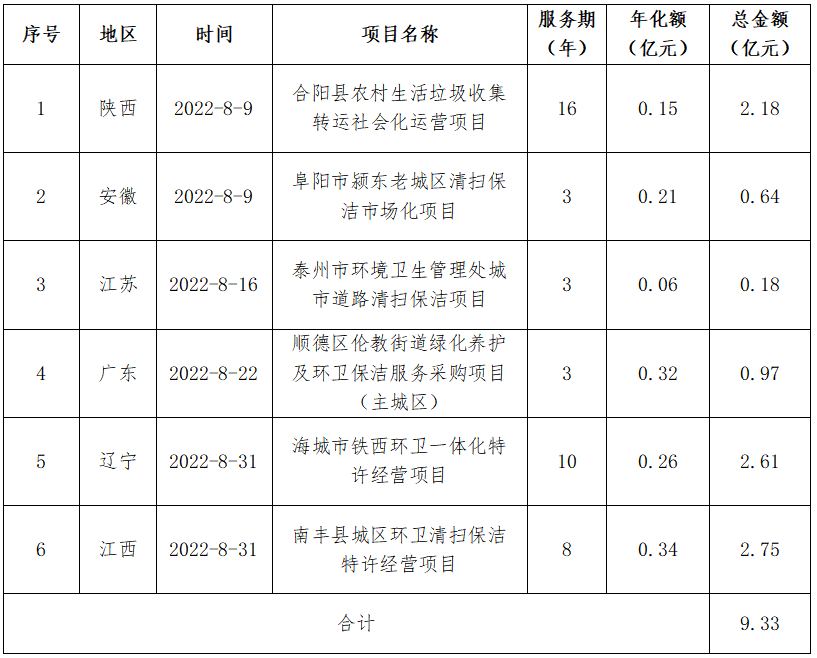 表2 北控城市環(huán)境8月中標(biāo)項目匯總