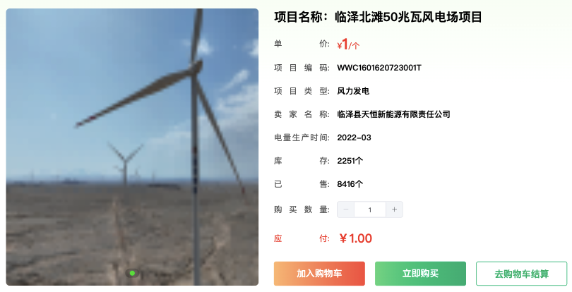 而這個(gè)標(biāo)價(jià)1元的風(fēng)電綠證,已售出8416個(gè),庫(kù)存僅2251個(gè)。