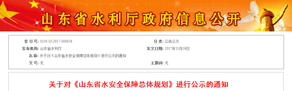 近日,在山東水利廳獲悉關(guān)于對《山東省水安全保障總體規(guī)劃》進行公示的通知,全文如下: