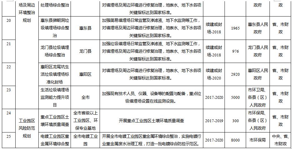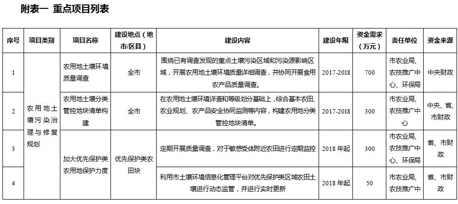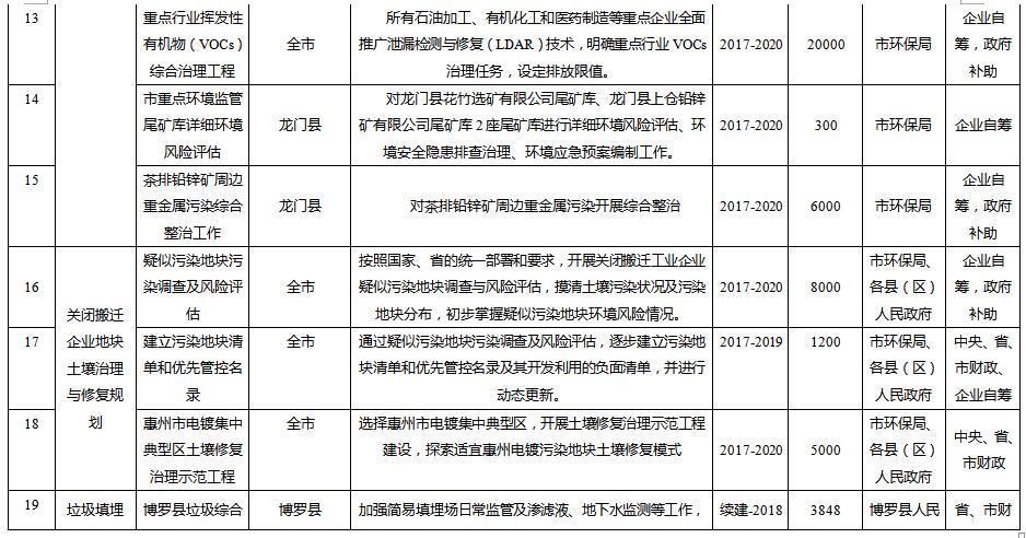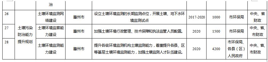 規(guī)劃從惠州市農(nóng)用地土壤分區(qū)分類管控與治理修復(fù)、在產(chǎn)企業(yè)用地土壤環(huán)境風(fēng)險(xiǎn)管控、關(guān)閉搬遷企業(yè)地塊土壤治理與修復(fù)、垃圾填埋場(chǎng)及周邊環(huán)境整治、工業(yè)園區(qū)風(fēng)險(xiǎn)防范、未利用地保護(hù)、土壤污染防治能力提升等方面建設(shè)6大類重點(diǎn)項(xiàng)目。其中: