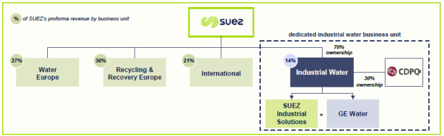 看重了GE水處理在工業(yè)水領(lǐng)域的優(yōu)勢(shì),蘇伊士環(huán)境聯(lián)合加拿大基金公司Caisse de dép?t et placement du Québec (CDPQ)以32億歐元收購(gòu)了GE的全部股權(quán),兩家將組成合資公司,其中蘇伊士環(huán)境持股70%。Jean-Louis Chaussade先生透露,GE水處理的出售競(jìng)標(biāo)已經(jīng)進(jìn)行好幾輪了,在第三輪也是最后一輪的對(duì)手就剩下了剛剛在去年年底收購(gòu)了法國(guó)家具零售巨頭BUT的美國(guó)私募基金 Clayton, Dubilier&Rice。蘇伊士環(huán)境的財(cái)務(wù)主管Christophe Cross則表示收購(gòu)一旦正式完成后蘇伊士將對(duì)其增資7.5億歐元。