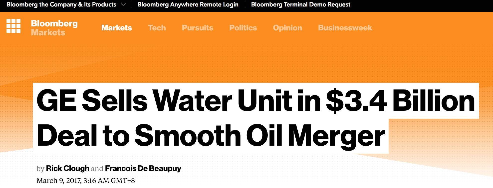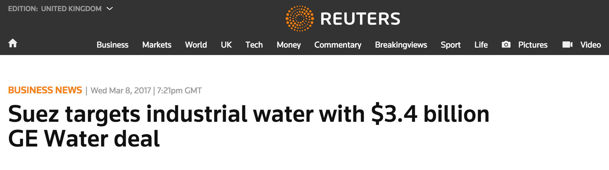 水行業(yè)巨頭法國(guó)蘇伊士環(huán)境聯(lián)合加拿大第二大養(yǎng)老金投資管理機(jī)構(gòu)—魁北克儲(chǔ)蓄投資集團(tuán)(Caisse de dép?t et placement du Québec )正式確認(rèn)收購(gòu)GE水處理。GE水處理是在2016年10月宣布出售的,之后曾出現(xiàn)過(guò)諸如威立雅、全球最大儀器公司丹納赫集團(tuán)(Danaher Corporation)、著名的私人股權(quán)投資和投資管理公司黑石集團(tuán)(Blackstone Group)等潛在買(mǎi)家的傳聞。 在上個(gè)月底,蘇伊士環(huán)境的新聞發(fā)言人也對(duì)外宣布正在考慮收購(gòu)GE工業(yè)水處理業(yè)務(wù)的可能性。是什么讓蘇伊士在官宣之后的半個(gè)月內(nèi)就完成這宗收購(gòu)呢?今天我們將帶大家看看全球各大媒體對(duì)這次收購(gòu)的解讀。