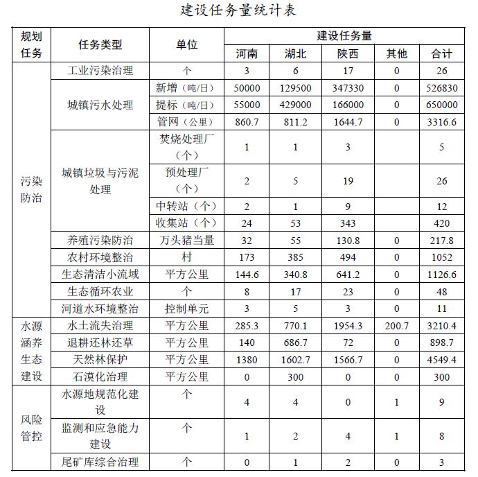 圍繞規(guī)劃目標(biāo),規(guī)劃實施污染防治、水源涵養(yǎng)與生態(tài)建設(shè)、風(fēng)險管控3大類建設(shè)任務(wù),估算總投資196億元。其中:工業(yè)污染防治項目26項,估算投資6.00億元;城鎮(zhèn)污水處理新增污水處理能力526830噸/日,新增管網(wǎng)3317公里,提標(biāo)改造能力650000噸/日,估算投資43.17億元;垃圾和污泥采取收集、預(yù)處理、轉(zhuǎn)運、焚燒進(jìn)行綜合處理,新增垃圾和污泥處理處置能力8000噸/日,估算投資35.62億元;養(yǎng)殖污染防治新增217.8萬頭豬當(dāng)量治理能力,估算投資10.94億元;農(nóng)村環(huán)境綜合整治新增建制村1052個,估算投資15.76億元;生態(tài)清潔小流域治理面積1126.6平方公里,估算投資11.27億元;生態(tài)循環(huán)農(nóng)業(yè)與面源污染綜合治理試點48個,估算投資14.50億元;河道綜合整治(含人工濕地)11個控制單元,估算投資5.25億元;綜合治理水土流失面積3210平方公里,估算投資25.68億元;退耕還林還草和石漠化治理、天然林保護(hù)工程,估算投資16.4億元;水源地規(guī)范化建設(shè)項目9個,估算投資5.93億元;監(jiān)測和應(yīng)急能力建設(shè)項目8個,估算投資1.14億元;尾礦庫綜合治理3個,估算投資4.35億元。