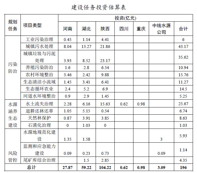 按任務(wù)類型分,水污染防治類投資142.51億元,水源涵養(yǎng)生態(tài)建設(shè)類投資42.07億元,風(fēng)險管控類投資11.42億元。