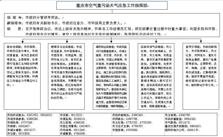 根據(jù)工作需要,在重慶市人民政府突發(fā)事件應急委員會統(tǒng)一領(lǐng)導下,成立重慶市空氣重污染天氣應急工作指揮部(以下簡稱市指揮部)。市指揮部實行指揮長負責制,由市政府分管領(lǐng)導同志擔任指揮長,市政府有關(guān)副秘書長,市政府應急辦、市環(huán)保局主要負責人任副指揮長,統(tǒng)一領(lǐng)導和組織紅色、橙色預警空氣重污染天氣應對工作。