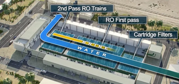 這個新的海水淡化廠建在一個現(xiàn)有反滲透海水淡化廠旁邊,占地面積約17.5公頃。太陽能面板組將安裝在距離海水淡化廠1公里以外90公頃的土地上。
