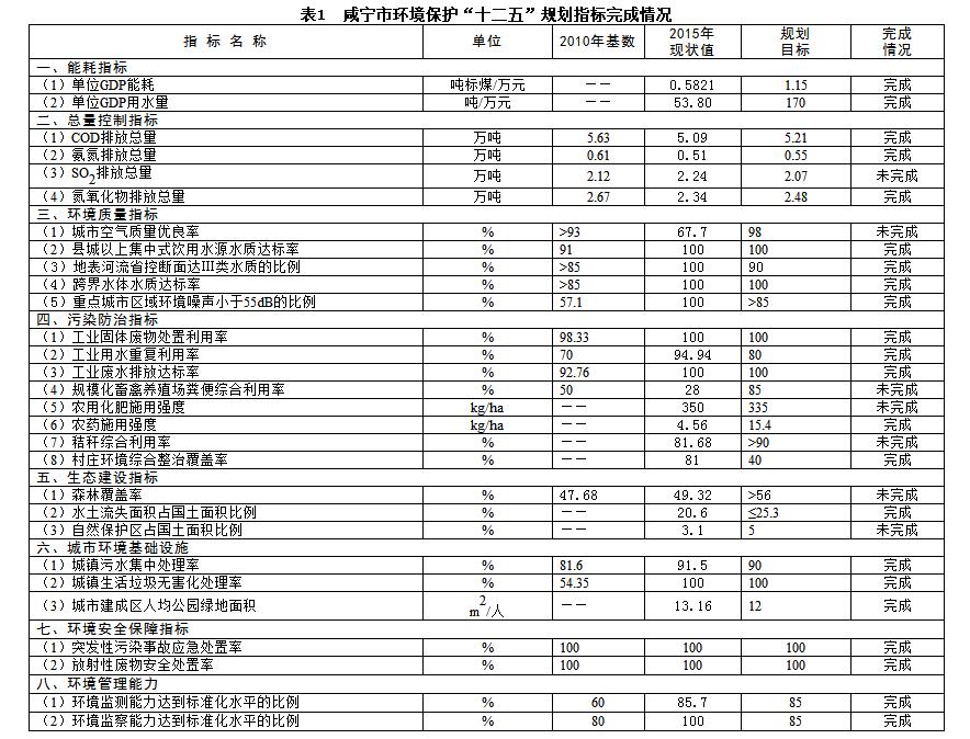 表1 咸寧市環(huán)境保護(hù)“十二五”規(guī)劃指標(biāo)完成情況