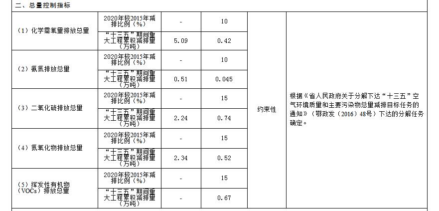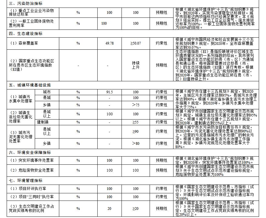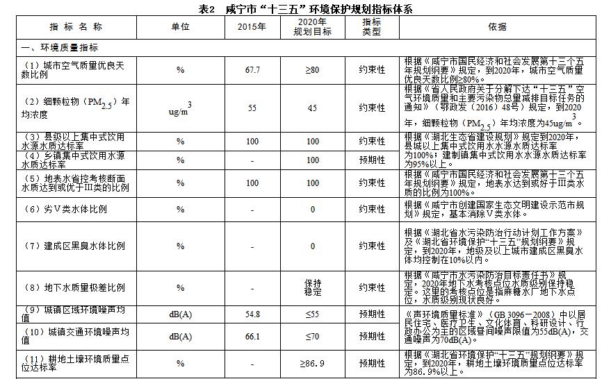 根據(jù)國(guó)家、省環(huán)境保護(hù)“十三五”規(guī)劃相關(guān)要求,結(jié)合咸寧實(shí)際情況,“十三五”期間環(huán)保規(guī)劃指標(biāo)如下。