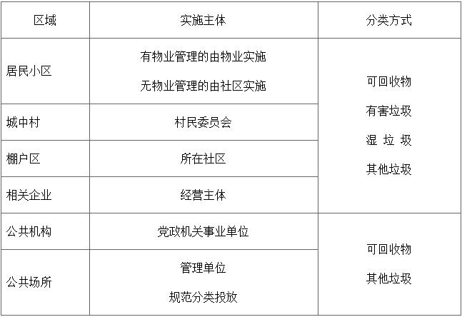 居民小區(qū):有物業(yè)管理的由物業(yè)單位配齊分類收集容器,沒有物業(yè)管理的由社區(qū)負責(zé)配齊。由社區(qū)向居民免費提供家用分類垃圾袋。新建小區(qū)必須配建分類收集點或垃圾房,新建大型小區(qū)必須配建生活垃圾分類中轉(zhuǎn)站。