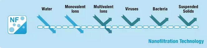 傳統(tǒng)的工業(yè)純水、瓶裝純凈水使用的大多是反滲透技術(shù),而納濾技術(shù)大家一般認(rèn)為它是介于超濾與反滲透之間的一種過濾技術(shù)。但因?yàn)樗谙到y(tǒng)設(shè)計(jì)、操作模式上跟反滲透接近,因此不少人會(huì)認(rèn)為它是一種“疏松”的反滲透。納濾是孔徑尺寸為0.001微米的選擇性膜過濾技術(shù),因?yàn)樗粌H能截留分子量較大的有機(jī)物以及多價(jià)離子,允許小分子有機(jī)物和單價(jià)離子透過,并且能在高溫、酸、堿等苛刻條件下運(yùn)行,具有耐污染等優(yōu)點(diǎn),這些特性使其在實(shí)際運(yùn)行時(shí),所需壓力低、膜通量高、運(yùn)行費(fèi)用較低。