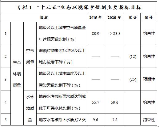 ——環(huán)境質(zhì)量控制目標(biāo)指標(biāo)。到2020年,大氣環(huán)境質(zhì)量方面,地級及以上城市空氣質(zhì)量全年達標(biāo)天數(shù)比例平均達到83.8%以上,重度及以上污染天數(shù)比例下降25%,未達標(biāo)地級及以上城市PM2.5年均濃度下降12%。水環(huán)境質(zhì)量方面,全區(qū)地表水質(zhì)量考核斷面水質(zhì)達到或優(yōu)于Ⅲ類比例總體達到59.6%,劣Ⅴ類水質(zhì)比例控制在3.8%,重要江河湖泊水功能區(qū)水質(zhì)達標(biāo)率達到71%,全區(qū)地下水質(zhì)量考核點位水質(zhì)級別保持穩(wěn)定且極差比例控制在21.3%。土壤環(huán)境質(zhì)量方面,全區(qū)土壤環(huán)境質(zhì)量總體保持穩(wěn)定,農(nóng)用地和建設(shè)用地土壤環(huán)境安全得到基本保障,受污染耕地安全利用率和污染地塊安全利用率均達到90%以上。生態(tài)環(huán)境質(zhì)量方面,森林覆蓋率達23%,活立木蓄積量達16億立方米,濕地保有量達9000萬畝,草原植被蓋度達到45%,重點生態(tài)功能區(qū)所屬縣域生態(tài)環(huán)境狀況指數(shù)達到48.9以上。
