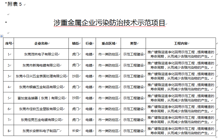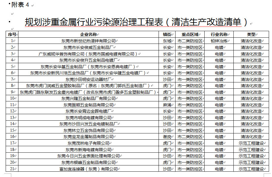 4. 規(guī)劃涉重金屬行業(yè)污染源治理工程表(清潔生產(chǎn)