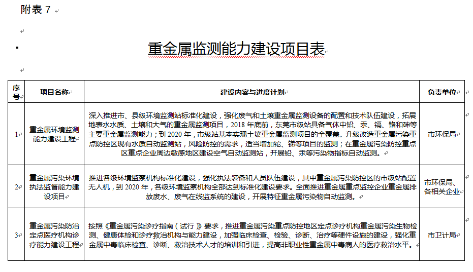 2018-2020年期間,東莞市計劃開展重金屬環(huán)境監(jiān)測能力建設(shè)工程3項,分別是重金屬環(huán)境監(jiān)測能力建設(shè)工程、重金屬污染環(huán)境執(zhí)法監(jiān)督能力建設(shè)項目、重金屬污染防治定點醫(yī)療機構(gòu)診療能力建設(shè)工程。詳見附表7。