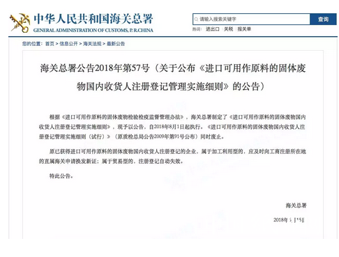 6月15日,海關(guān)總署發(fā)布今年第57號(hào)文件,根據(jù)《進(jìn)口可用作原料的固體廢物檢驗(yàn)檢疫監(jiān)督管理辦法》,海關(guān)總署制定了《進(jìn)口可用作原料的固體廢物國(guó)內(nèi)收貨人注冊(cè)登記管理實(shí)施細(xì)則》,現(xiàn)予以公告,自2018年8月1日起執(zhí)行?!哆M(jìn)口可用作原料的固體廢物國(guó)內(nèi)收貨人注冊(cè)登記管理實(shí)施細(xì)則(試行)》(原質(zhì)檢總局公告2009年第91號(hào)公布)同時(shí)廢止。