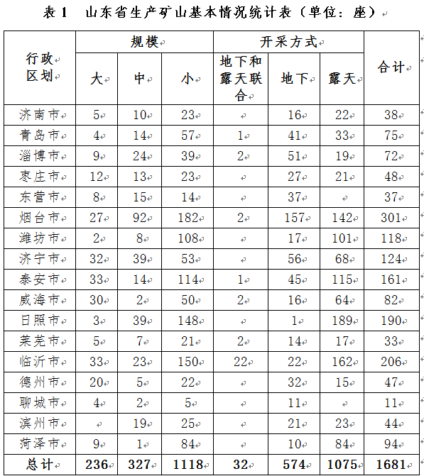 截至2017年,全省已發(fā)現(xiàn)礦產(chǎn)148種,查明資源儲(chǔ)量的有85種。其中,煤、石油、天然氣、地?zé)岬饶茉吹V產(chǎn)7種,金、鐵、銅等金屬礦產(chǎn)25種,石灰?guī)r、花崗巖、石墨、石膏、滑石等非金屬礦產(chǎn)50種,地下水、礦泉水等水汽礦產(chǎn)3種。全省開(kāi)發(fā)利用礦產(chǎn)60余種(含亞礦種),主要開(kāi)采礦種為石油、煤、金、鐵、石灰?guī)r、花崗巖等,全省共有各類生產(chǎn)礦山1681座(包括62座在建礦山)(表1),歷史遺留礦山(包括廢棄、政策性關(guān)閉及閉坑礦山)7991座(表2)。