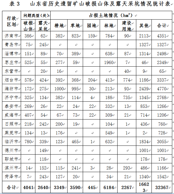 全省露天開(kāi)采礦種主要有石灰?guī)r、花崗巖、磚瓦用粘土等非金屬建筑材料礦產(chǎn),在開(kāi)采過(guò)程中造成了地形地貌景觀破壞,也占?jí)汉蛽p毀了大量的土地資源。目前,全省尚有破損山體4706處、露天采坑3109處,占損土地資源總計(jì)4.28萬(wàn)公頃。其中,歷史遺留礦山破損山體4041處、露天采坑2640處,占損土地資源3.24萬(wàn)公頃,主要分布在濟(jì)南、煙臺(tái)、濰坊、臨沂等地(表3);生產(chǎn)礦山造成的破損山體665處、露天采坑469處,占損土地資源1.04萬(wàn)公頃,主要分布在煙臺(tái)、泰安、臨沂等地。