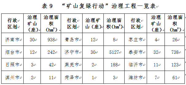 部署開(kāi)展“三區(qū)兩線”可視范圍內(nèi)歷史遺留露天開(kāi)采礦山地質(zhì)環(huán)境治理工程,到2020年治理歷史遺留露天開(kāi)采礦山577座,治理面積0.45萬(wàn)公頃,主要分布于青島、煙臺(tái)、泰安、日照、臨沂等地(表8)。