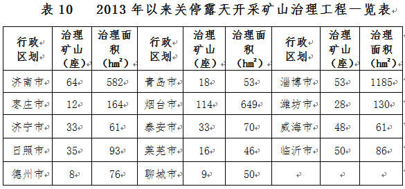 2013年以來(lái)全省關(guān)停露天開(kāi)采礦山1539座,已治理礦山267座,未治理礦山1272座。部署到2020年治理礦山518座,治理面積0.33萬(wàn)公頃(含“三區(qū)兩線”可視范圍內(nèi)歷史遺留礦山0.09萬(wàn)公頃),主要分布于濟(jì)南、淄博、煙臺(tái)等地(表10)。
