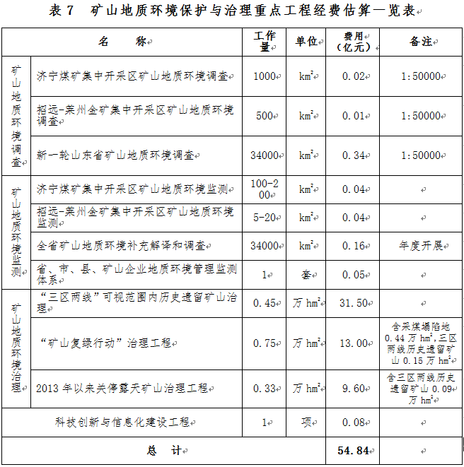 在濟(jì)寧煤礦集中開(kāi)采區(qū)、招遠(yuǎn)-萊州金礦集中開(kāi)采區(qū)開(kāi)展礦山地質(zhì)環(huán)境專項(xiàng)調(diào)查,在全省開(kāi)展新一輪礦山地質(zhì)環(huán)境詳細(xì)調(diào)查。調(diào)查費(fèi)用估算為0.37億元。