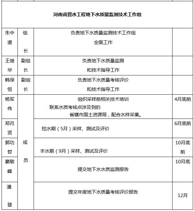 成立河南省碧水工程地下水質(zhì)量監(jiān)測(cè)技術(shù)工作組,由河南省地質(zhì)環(huán)境監(jiān)測(cè)院副院長(zhǎng)朱中道任組長(zhǎng),總工程師王繼華、實(shí)驗(yàn)測(cè)試中心主任韓保恒任副組長(zhǎng),工作組成員:楊軍偉、鄭月賢、郭功哲、竇敬峰、潘登等。部門負(fù)責(zé)牽頭,具體工作由河南省地質(zhì)環(huán)境監(jiān)測(cè)院承擔(dān),省轄市國(guó)土資源局從事地質(zhì)環(huán)境監(jiān)測(cè)工作的負(fù)責(zé)人參與配合。