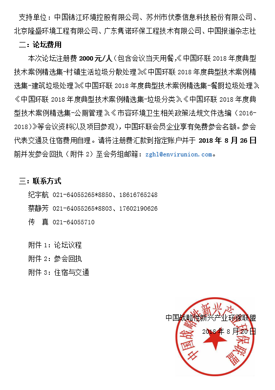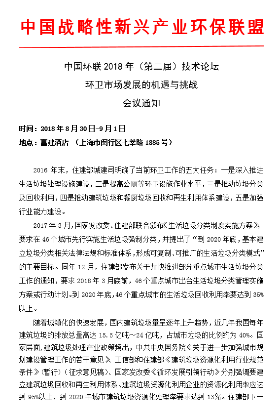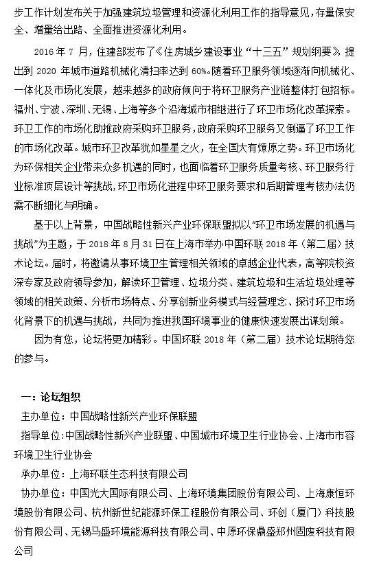 中國環(huán)聯(lián)2018年(第二屆)技術(shù)論壇 環(huán)衛(wèi)市場發(fā)展的機遇與挑戰(zhàn)