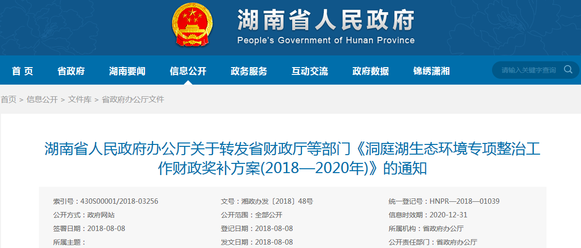 日前,湖南省人民政府辦公廳發(fā)布了關(guān)于轉(zhuǎn)發(fā)省財(cái)政廳等部門(mén)《洞庭湖生態(tài)環(huán)境專項(xiàng)整治工作財(cái)政獎(jiǎng)補(bǔ)方案(2018—2020年)》的通知,具體內(nèi)容如下: