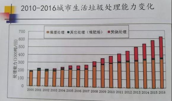2016年,全國設(shè)市城市生活垃圾無害化處理率達到96.6%。全國657個設(shè)市城市生活垃圾清運量2.03億噸,處理能力為62.1萬噸/日,無害化處理量也為1.97億噸。其中衛(wèi)生填埋量為1.19億噸。焚燒處理量為7378萬噸/年;生活垃圾堆肥廠(含綜合處理)處理量為429萬噸。按生活垃圾清運量統(tǒng)計分析填埋、堆肥和焚燒處理比例分別為58.5%、2.1%(其中包括綜合處理廠數(shù)據(jù))和36.3%,其余3.1%為堆放和簡易填埋處理。