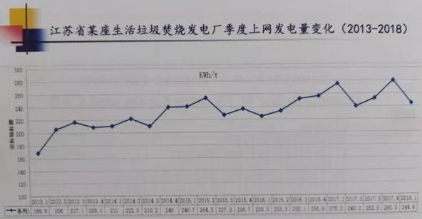 中國的生活垃圾水分比較高,一般在垃圾池中放七天左右,使大部分水分能夠析出。這樣使垃圾不僅好燒,還能用于發(fā)電。在世界范圍內(nèi),中國的焚燒處理工藝還是比較高的。上圖是江蘇省某生活垃圾焚燒發(fā)電廠季度上網(wǎng)發(fā)電情況(2013-2018),這座焚燒廠采用的是爐排爐的工藝,可以看出,這幾年的發(fā)電情況呈逐年上升的趨勢。